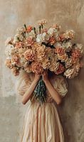 Dit kunstwerk toont een vrouw die een grote bos anjers voor haar gezicht houdt, waardoor haar identiteit volledig verborgen blijft. De anjers hebben zachte, pastelachtige tinten van crème en perzik, wat een serene en rustgevende sfeer creëert. De vrouw draagt een elegante, vintage jurk met volumineuze mouwen, wat bijdraagt aan de romantische en nostalgische uitstraling van de afbeelding. De achtergrond is verweerd en rustiek, met subtiele texturen die diepte en karakter aan het beeld toevoegen.