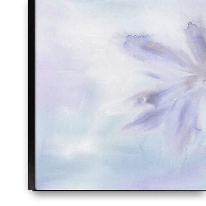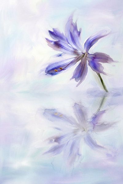 Deze foto toont een etherische, bijna schilderachtige bloem in zachte lila- en blauwtinten. De bloemblaadjes lijken losjes en transparant, alsof ze met aquarelverf zijn aangebracht. Het licht is diffuus en omhullend, waardoor harde lijnen ontbreken en alles vloeiend in elkaar overgaat.