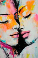Twee gezichten versmelten in een kleurrijke dans van levendige penseelstreken. Intens roze en fel oranje omlijsten de tere lippen, terwijl zachte rondingen en gesloten ogen wijzen op een intieme band. Het expressieve kleurenpalet straalt emotie uit en nodigt de kijker uit om zich onder te dompelen in de diepten van deze zielsvolle ontmoeting.