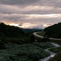 Dit beeld is gemaakt op het moment dat de dag langzaam kantelt richting avond. De zon staat laag, grotendeels verborgen achter wolken en bergen, maar laat nog net genoeg licht door om het landschap richting te geven. De weg slingert het dal in en fungeert als stille gids door het beeld, terwijl het…