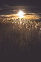 Dansende rietpluimen in een rietkraag tijdens een zonsondergang in de Nederlandse polder. Prachtige tegenlicht foto met sfeervol contrast en warme gloed in de avondzon