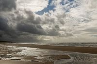 Door tegen de zon in te fotograferen glanzen de waterpartijen op het strand extra op. De wolken worden door dit standpunt extra donker, wat een mooi contrast geeft. Egmond aan Zee in oktober 2012