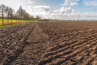 Tegenlichtopname van een pas geploegde akker nabij de stad Dordrecht, provincie Zuid-Holland. Aan één kant staat een rij hoge bomen. Aan het einde van de akker is een schuur zichtbaar. Het is een bewolkte dag in het winter seizoen.