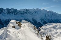 Voor het Mont-Blanc-massief, vanaf de aiguilles Rouges, op een besneeuwde bergkam op off-piste skiën. Onder de hellingen van Chamonix en het Brévent gebied.