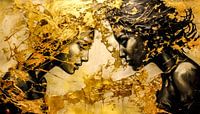 In dit expressieve schilderij ontmoeten twee gezichten elkaar, verbonden door een web van gouden lijnen en texturen die als vloeibaar goud over het doek lijken te stromen. De twee figuren symboliseren tegenstellingen - licht en donker, licht en schaduw, yin en yang. Hun gelaatstrekken, fijn en gedetailleerd, staan in schril contrast met elkaar. Het ene gezicht straalt met heldere, bijna stralende tinten, terwijl het andere is ondergedompeld in diep zwart. Deze twee wezens lijken in een moment van stille communicatie, alsof ze de balans van het universum belichamen.