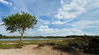 Scheefstaande boom, leunend tegen de wind in met op achtergrond verwaaide wolken. De boom staat wat verloren in z'n eentje de elementen te trotseren bij het Vogelmeer in de Kennemerduinen.