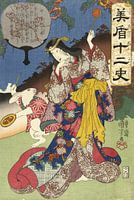 Dansende vrouw en witte haas; uit een serie met parodieën op twaalf tekens van de dierenriem.