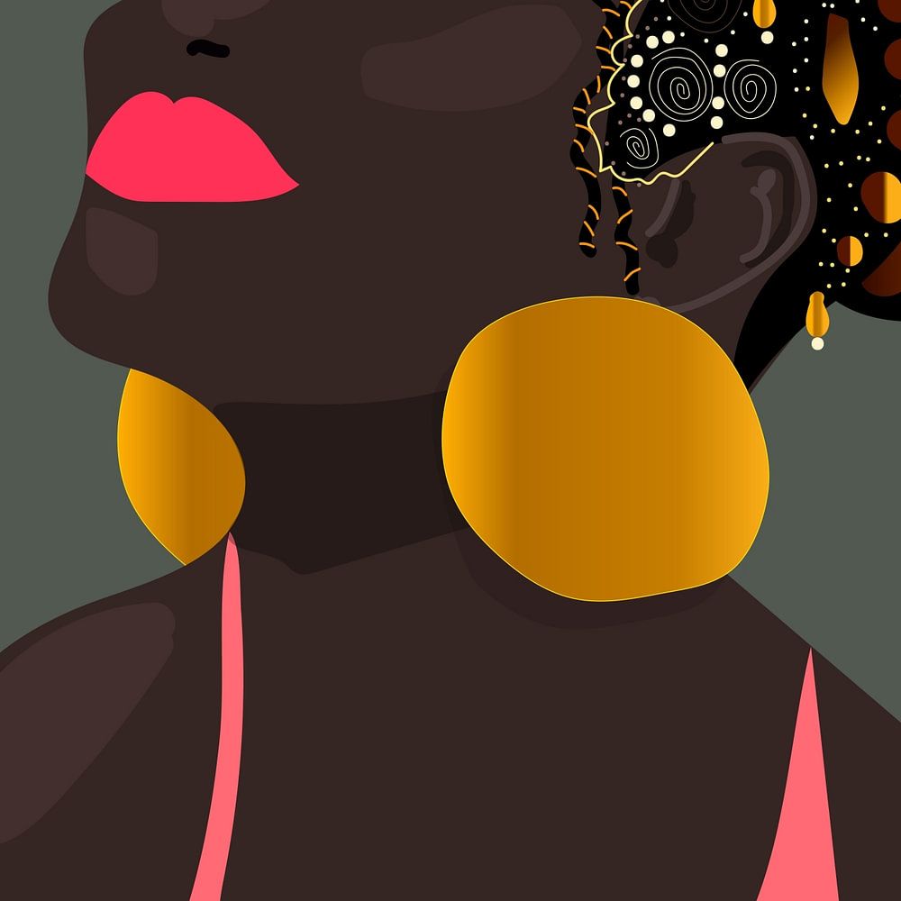 Een tekening van een jonge Afrikaanse vrouw met gouden versieringen.