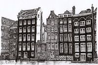 Tekening van het Damrak in Amsterdam. Deel van het oudeste gedeelte van Amsterdam.