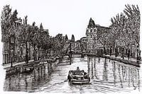 Bootje op de Kloveniersburgwal kanaal in Amsterdam. Rondvaart door de oude kanalen van Amsterdam in de zomer. Rustig en sereen vaart het bootje. Het is nog vroeg .Originele tekening is gemaakt met Japanse Sakura fineliners met inkt die wel 200 jaar goed blijft!