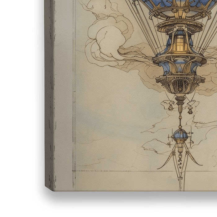 Trefwoorden: Steampunk, luchtballon, Vintage, Technische Illustratie, Sierlijk Ontwerp, Gedempte kleuren, Beeldende Kunst, Lijntekening, minimalisme