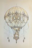 Tekening van een sierlijke luchtballon met een gedetailleerd ontwerp. Combinatie van technische en beeldende kunst, illustratie, nauwkeurige lijntekening met schaduwtechnieken die diepte en textuur aan de afbeelding geven. De kleuren zijn gedempte tinten blauw, beige, bruin en goud, die bijdragen aan de vintage uitstraling.