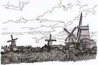 Tekening van de zomerse Zaanse Schans Windmolens in Noord-Holland van Nederland.