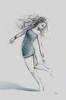 Een tekening van een danseres, ingekleurd in lichtgrijs, blauw en goudgele hooglichten. Deze jonge vrouw heeft krullende haren die meedansen met haar sierlijke bewegingen. De basis van deze tekening is gemaakt op papier, met potlood. Door deze tekening te digitaliseren en in te kleuren in photoshop ontstaat dit interessante effect. Deze jonge vrouw balanceert op één been, haar blik gericht op de grond om haar evenwicht te bewaren.