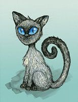 Een tekening met viltstiften van een grappige Siamese kat. Hij is in een cartoonachtige stijl getekend en ziet er enigszins slordig en brutaal uit. Hij kijkt naar links en zijn staart krult rechts van hem omhoog. Hij heeft enorme felblauwe ogen die glimmen. De achtergrond is een papierstructuur die verloopt van licht naar iets donkerder…
