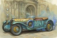 Tekening van een klassieke auto, geparkeerd voor een oud gebouw. De auto is een oldtimer cabrio, een vintage auto met open dak. De kleuren in de tekening zijn voornamelijk blauw, goud en bruin, met een verweerde en antieke uitstraling. De tekening heeft een dromerige en…