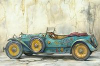Tekening van een klassieke, antieke auto in zijaanzicht. De kleur van de oldtimer cabriolet is overwegend blauw met gele accenten op de wielen en andere details. De achtergrond is een verweerde muur met scheuren en vlekken, voor een vintage en verweerde uitstraling.