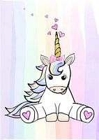 Lieve tekening van een zittende eenhoorn. Deze unicorn heeft roze hartjes bij zijn gouden hoorn en heeft ook prachtige regenboogmanen. Ze zit voor een aquarel achtergrond van mooi regenboogkleuren.
