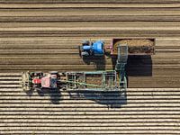 Aardappelrooien op een veld waar één machine de aardappelen opraapt en in een aanhangwagen laadt die getrokken wordt door een tractor die naast de rooier rijdt.