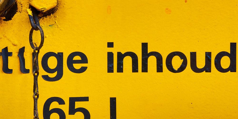 Close-up foto van een ventiel en tekst op een oude gele locomotief. De tekst is: "Nuttige inhoud 65 L.".
