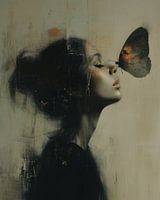 "Tell me everything you wish for", poëtisch portret van een jonge vrouw met een grote vlinder op haar neus. Kies zelf het formaat en materiaal bij dit bijzondere werk.