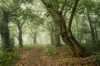 Bospad met oeroude kastanjebomen op een mistige september ochtend. De overhellende boom aan de rechterkant geeft dit verstilde bosgezicht een besloten karakter.