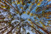 Verticaal uitzicht naar boven tussen grote dennenbomen in blauwe lucht en zonlicht