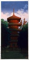 Dit indrukwekkende kunstwerk van Hasui Kawase, gepubliceerd in 1935, toont een majestueuze Japanse pagode bij het vallen van de avond. De houten structuur torent hoog boven het landschap uit en is gedeeltelijk gehuld in schaduwen, terwijl het bovenste gedeelte nog wordt verlicht door de laatste stralen van de ondergaande zon. Omringd…