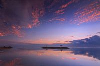 Deze foto is genomen in de ochtend voor zonsopgang in Bali Sanur direct aan het strand. Zicht op de zee tegen zonsopgang met 2 tempels in het water als golfbrekers. Reflectie van de paarse lucht en de roze wolken in het rustige water