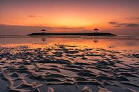 Deze foto is genomen in de ochtend voor zonsopgang in Bali Sanur direct aan het strand. Zicht op de zee tegen zonsopgang met 2 tempels in het water als golfbrekers. Reflectie van de paarse lucht en de roze wolken in het rustige water
