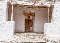 Verspreid over het landschap staan in en tussen dorpen kleine boeddhistische tempels in de uitgestrekte valleien van de Himalaya. Op de foto het overdekte portaal van een dorpstempel