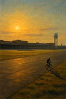 Dit kunstwerk is een eerbetoon aan de iconische voormalige luchthaven van Berlijn en nu het uitgestrekte stadspark Tempelhofer Feld. Het legt de uitgestrekte, stille grandeur van de ruimte vast in de schemering. De laaghangende zon creëert een schitterende gouden gloed over de uitgestrekte, open start- en landingsbaan en zet de…