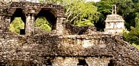 De ruïne muren op de voorgrond steken af van de jungle op de achtergrond. Op de heuvel een tweede tempel dat met lichtere stenen mooi oplicht.