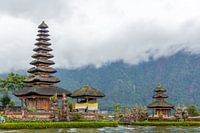 Tempels op het eiland Bali in Indonesië. Hindoe stijl architectuur. Bij een meer met bergen tijdens een bewolkte dag .