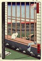 Een kat kijkt vanaf de vensterbank uit over de rijstvelden waar een stoet mensen op weg is naar een tempel. Aan de horizon is de berg Fuji zichtbaar.