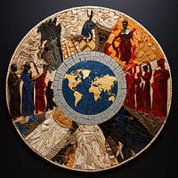 Dit schilderij, maakt deel uit van de 'Tijdreis' collectie. Het toont een betoverend weefsel van historische tijdperken die naadloos in elkaar overlopen, waarbij culturen verstrengeld raken en het levendige mozaïek van de menselijke geschiedenis door de eeuwen heen wordt onthuld.