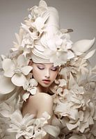 Fantasie portret van een vrouw gehuld in vilt bloemen en een vilten hoed.