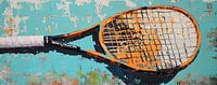 Tennis | Tennisracket - Op dit sport schilderij zie je een grote tennisracket, opvallend door de oranje en zwarte details, tegen een turquoise achtergrond die de aandacht trekt en energie uitstraalt.