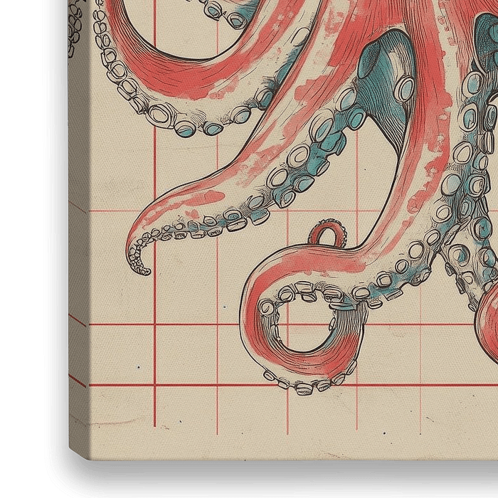 Deze expressieve octopus springt van het doek met roodblauwe inktachtige accenten. Het raster en de kartelige rand geven het geheel een retro stripboekgevoel. Perfect voor wie houdt van opvallende zeedieren met een knipoog.