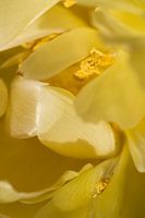 Close-up van een gele tulp. De nog dichtgevouwen tere blaadjes en poederachtige meeldraden zorgen voor een delicaat en zacht geheel