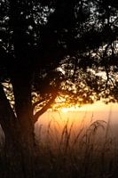 Landschap op de Terletse heide, in Rozendaal, op de Veluwezoom in Gelderland. Het is heel nevelig en sfeervol en de opkomende zon werpt een warme deken over de natuur.