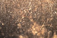 Close up van de met dauw bedekte grassen op de Terletse heide, in Rozendaal, op de Veluwezoom in Gelderland. Het licht is prachtig en warm door de opkomende zon doorheen de nevel.