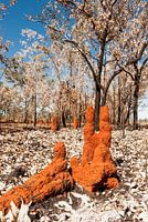 Tussen Pine Creek en Mataranka wacht je in het Northern Territory van Australië een onwerkelijk landschap: feloranje tot roodgekleurde termietenheuvels tussen bomen waarvan de bladeren bijna wit zijn gebleekt door de zon.