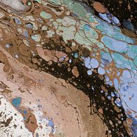 Het kleurpalet bestaat uit warme, aardse tinten die elkaar prachtig aanvullen. Zandbruin, koper en oker vloeien samen met koelere tonen als lichtblauw, turquoise en grijs. Subtiele glans in sommige delen zorgt voor een mineraalachtige uitstraling, alsof er stukjes gesteente of leem in verwerkt zitten. De combinatie voelt natuurlijk, rustig en luxe tegelijk.
