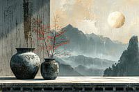 Details: stilleven, vaas, berglandschap, natuur, zon, ochtend, rustiek, minimalistisch, rood, grijs