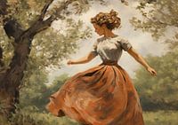 Terracotta Dans | Impressionistische Dans - We zien een vrouw in een landelijke setting, gehuld in een witte blouse en een wervelende terracotta rok. De penseelvoering en kleurkeuze suggereren een impressionistische stijl, waarbij de focus ligt op het spel van licht en schaduw door de bladeren heen, met een gevoel van beweging en levenslust die van het doek spat.