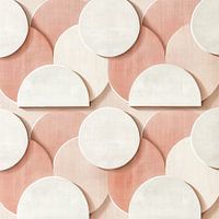 Modern abstracte afbeelding in organische en ronde vormen met diepte in de kleurstelling wit, beige, terracotta en roze. Mooie diepte die surrealistisch aandoet. Textiel gebruik in de vormen. Passend bij diverse stijlen en trends, waaronder modern abstract, abstract, terracotta,koraal. Artist: Bianca ter Riet