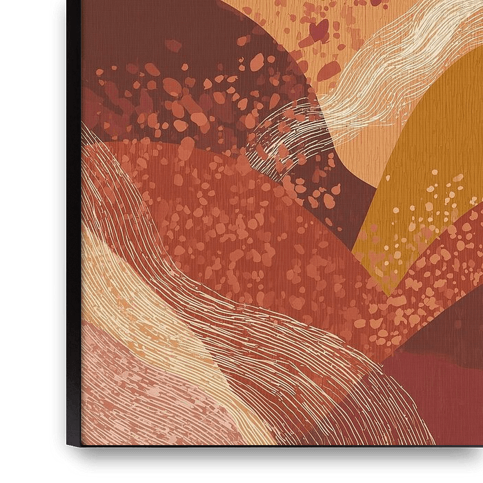 Een hypnotiserend abstract kunstwerk waar warme aardetinten samenvloeien in organische, golvende vormen. Laagjes van terracotta, oker en donkerrood worden doorsneden door grafische lijnstructuren en puntpatronen, creëerend een dynamische balans tussen chaos en harmonie. Het werk ademt boho-luxe en natuurlijke energie, perfect voor wie…