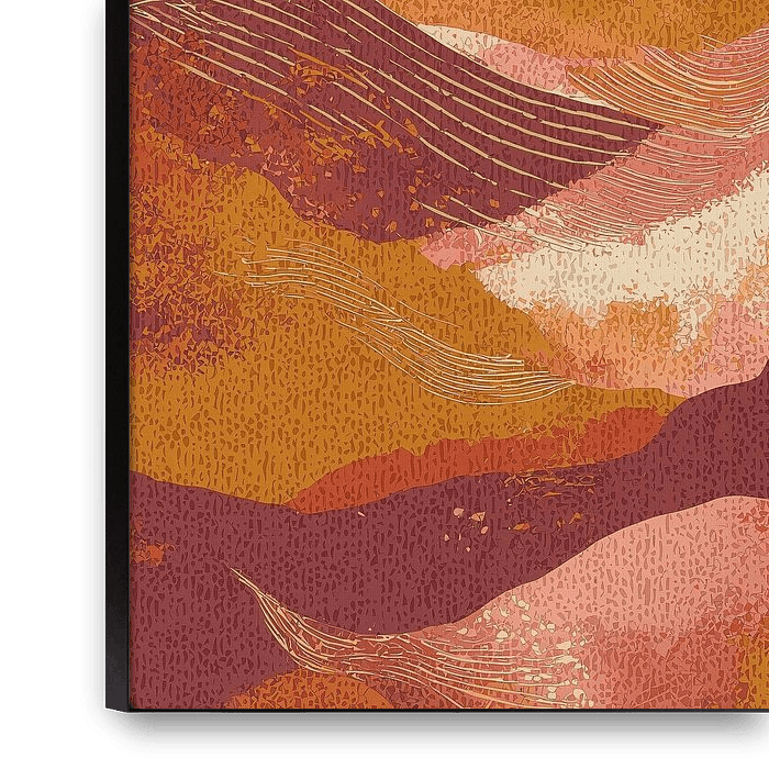 Een mesmeriserend abstract kunstwerk waar warme kleuren in gelaagde, vloeiende golven naar elkaar toe bewegen. Okergoud, diep bordeaux en zacht roze versmelten in een elegante choreografie van textuur en beweging, ondersteund door fijne lijnwerk dat ritme en dynamiek suggeert. Het werk ademt een zeitloze intimiteit uit met een…
