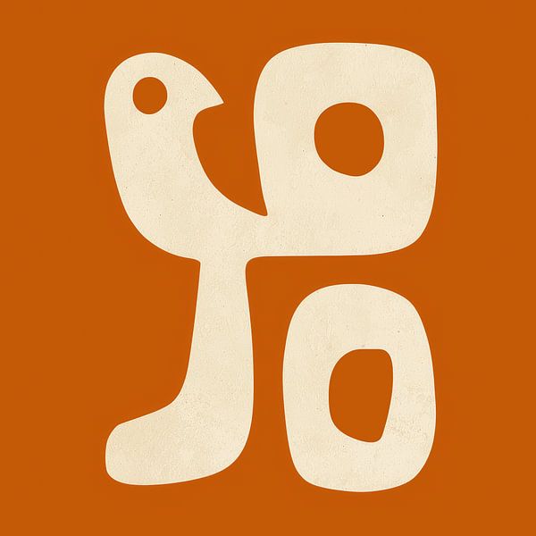 Een enkele, verkleinde vogel ontvouwt zich op warme, aardse oker - geen realistisch lichaam, maar pure kinderlijke essentie: een ronde kop met een geperforeerd oog, een gebogen nek die uitloopt in een open cirkel, poten als wortels of vraagtekens. De stijl is poëtisch minimalisme à la Joan Miró met de meditatieve helderheid van Japanse…